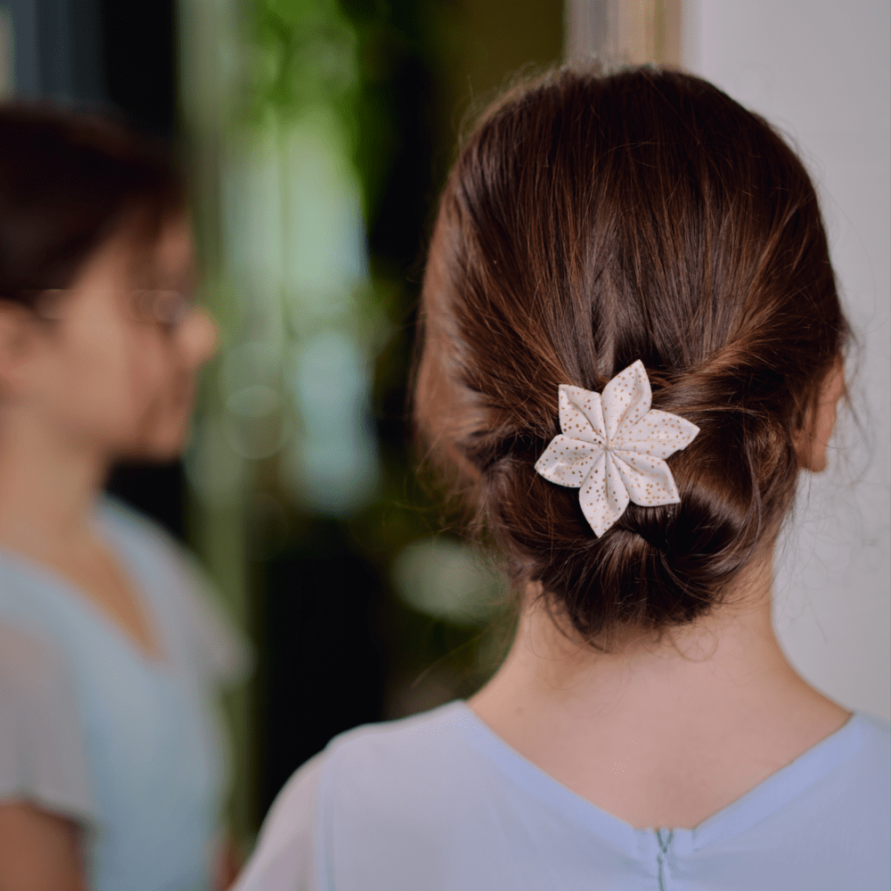 • Barrette à cheveux avec une fleur étoile qui se porte aussi bien en bout d’une natte que sur le côté de la tête pour retenir une mèche.