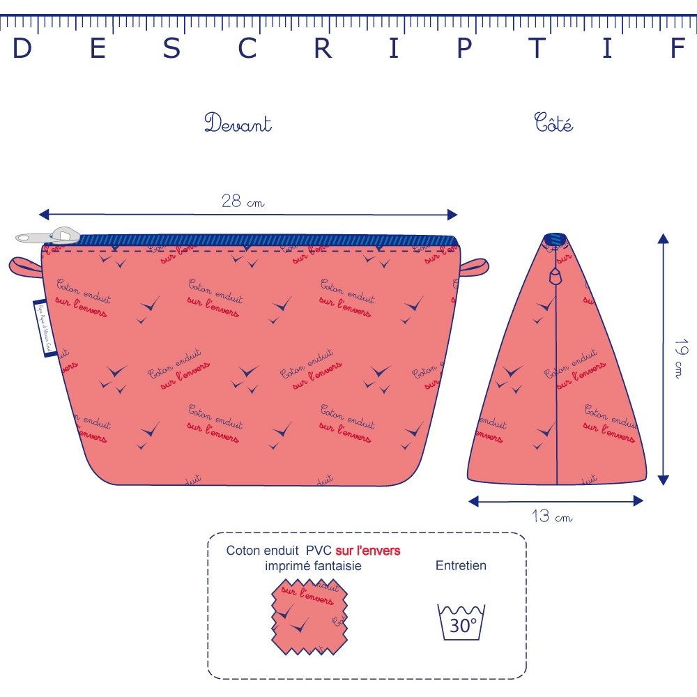 Confectionnée en tissu coton enduit imperméable et déperlant (pour la majorité de nos modèles - voir onglet "caractéristiques"), cette trousse est résistante à l'eau et très facile à nettoyer. La doublure intérieure enduite vous garantit une protection optimale contre les fuites et est très facile à nettoyer. Un simple coup de chiffon humide suffit pour la maintenir propre, assurant ainsi une hygiène impeccable.